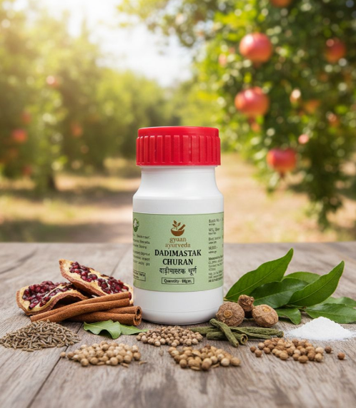 Dadimastak Churan is a classical Ayurvedic formulation mainly used for loss of appetite, indigestion, gas, abdominal discomfort, and diarrhea. It strengthens digestive fire and helps proper digestion of food.