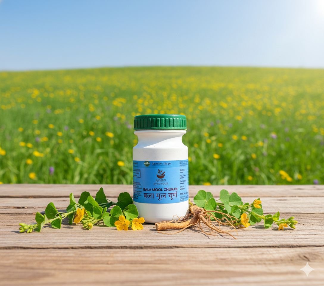 Bala Mool Churan is a classical Ayurvedic herbal powder prepared from the root of Bala plant (Sida cordifolia). It is traditionally known for its strength-promoting, Vata-pacifying, and rejuvenating properties.
